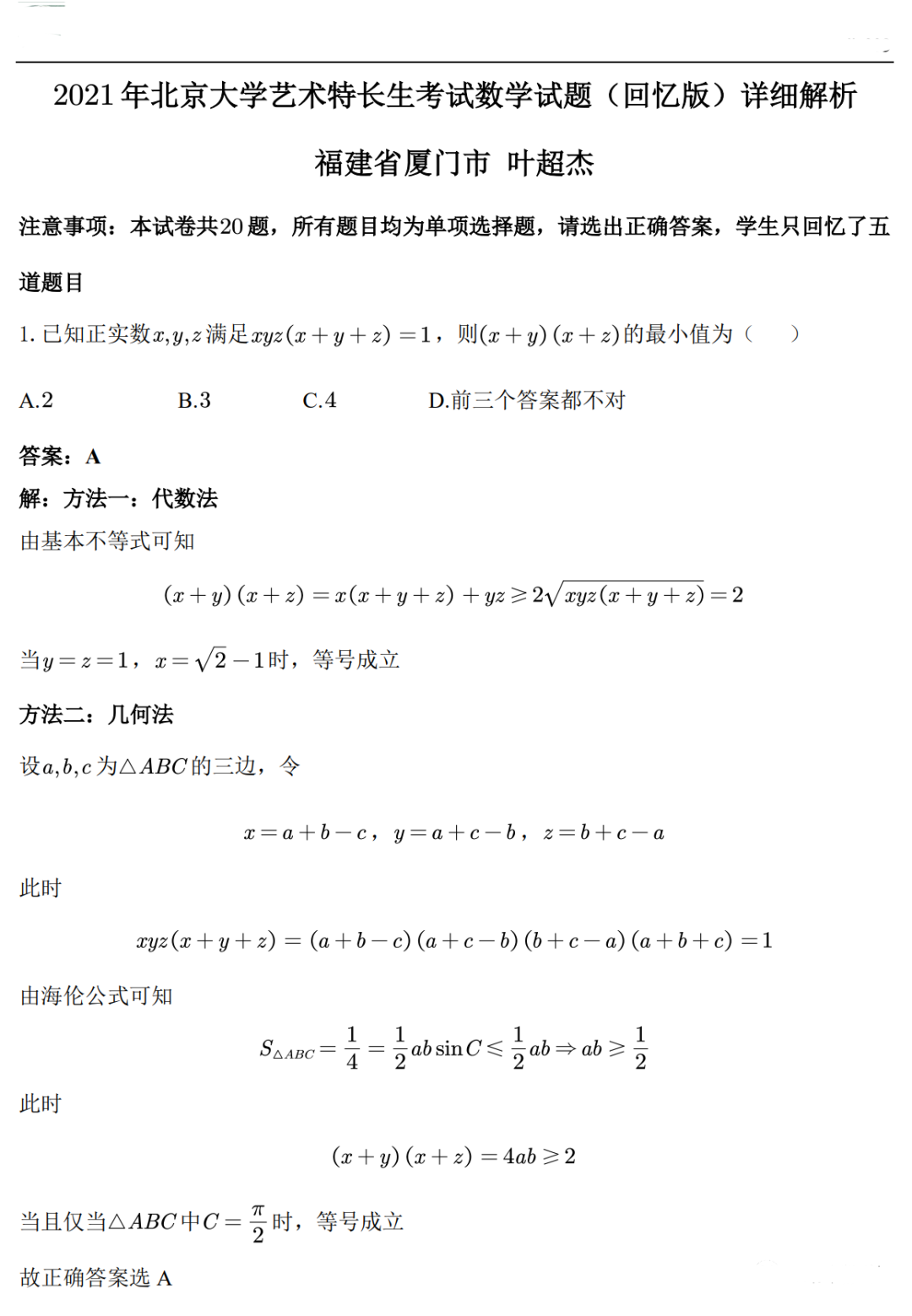北京admw360教研组为大家整理了北京大学2021艺术特长生考试数学试题(详解版),分享给各位小伙伴。