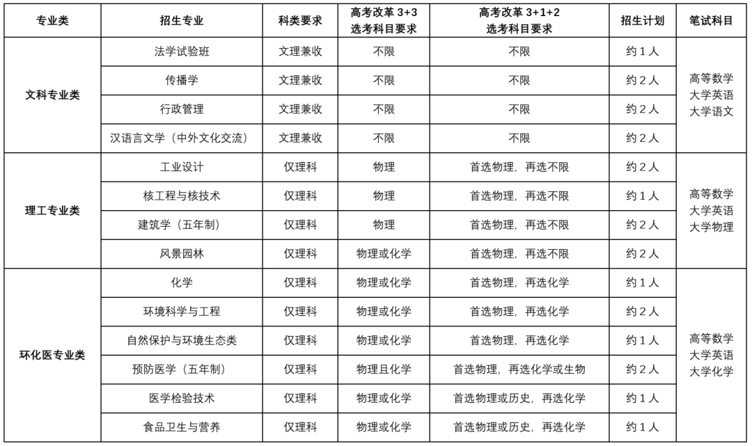 法学试验班、传播学、行政管理、汉语言文学、工业设计、核工程与核技术、建筑学、风景园林、化学、环境科学与工程、自然保护与环境生态类专业:按教育部、原卫生部和中国残疾人联合会印发的《普通高等学校招生体检工作指导意见》(简称指导意见)执行。