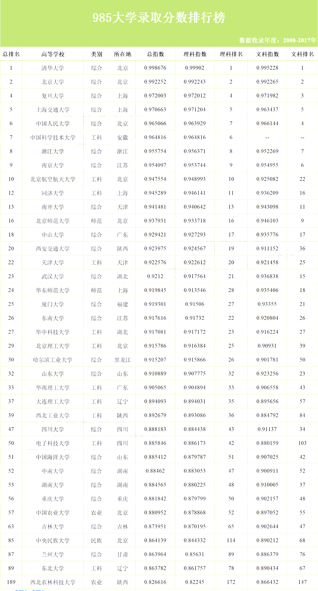 从近十年录取分数总排名来看,清华大学录取分总排名、理科录取分和文科录取分均位居中国高校第1位。北京大学录取分总排名、理科和文科录取分三项指标均仅次于清华大学,位居第2位。