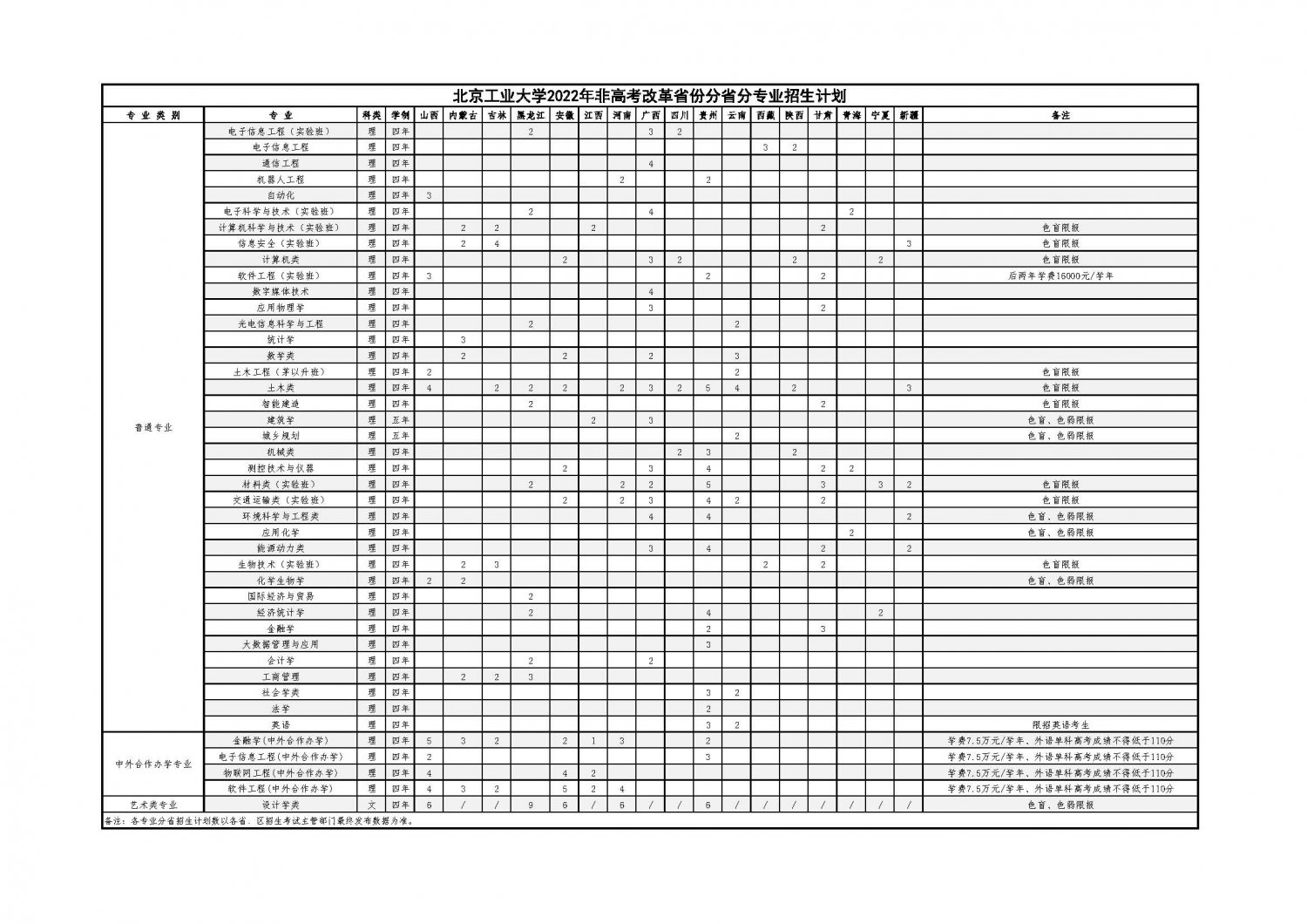 北京工业大学2022年非高考改革省份分省分专业招生计划