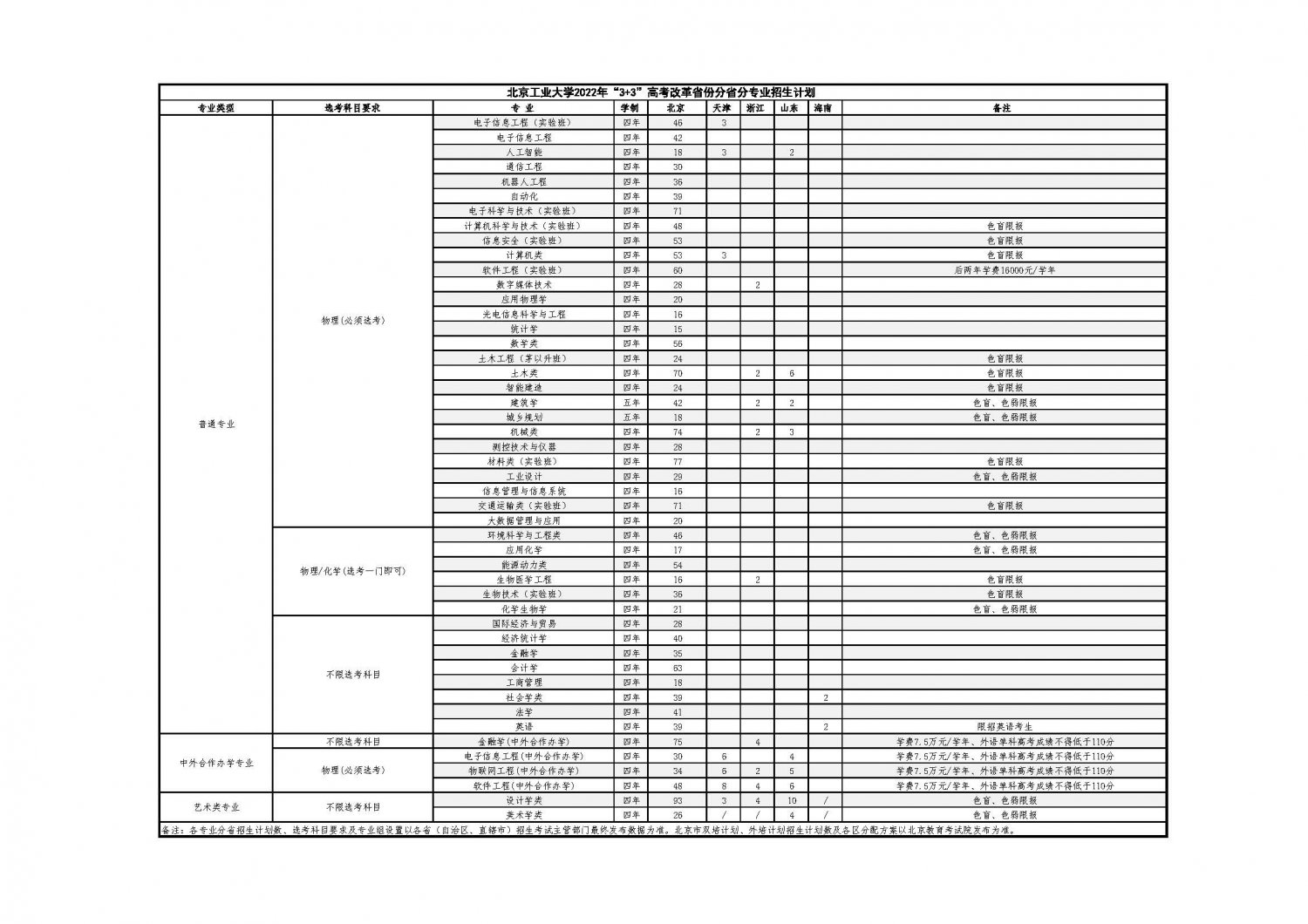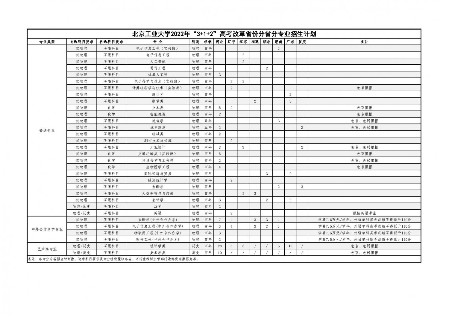 北京工业大学2022年“3+3”高考改革省份分省分专业招生计划