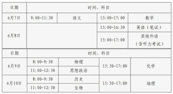 考试时间为6月7日至6月10日,下表为具体的考试科目安排。