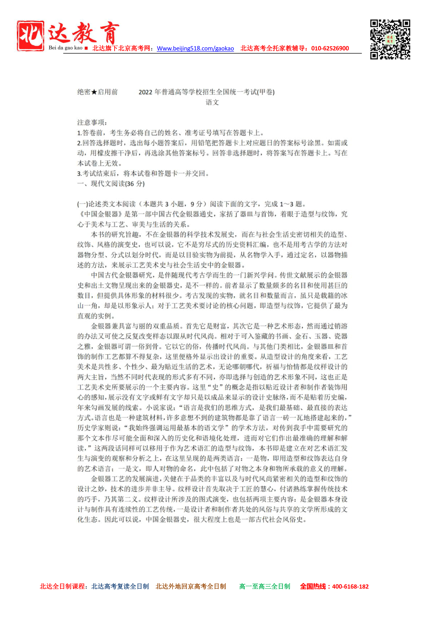北京admw360教研组为大家整理了2022高考(全国甲卷)语文试题及答案,希望对大家有所帮助。