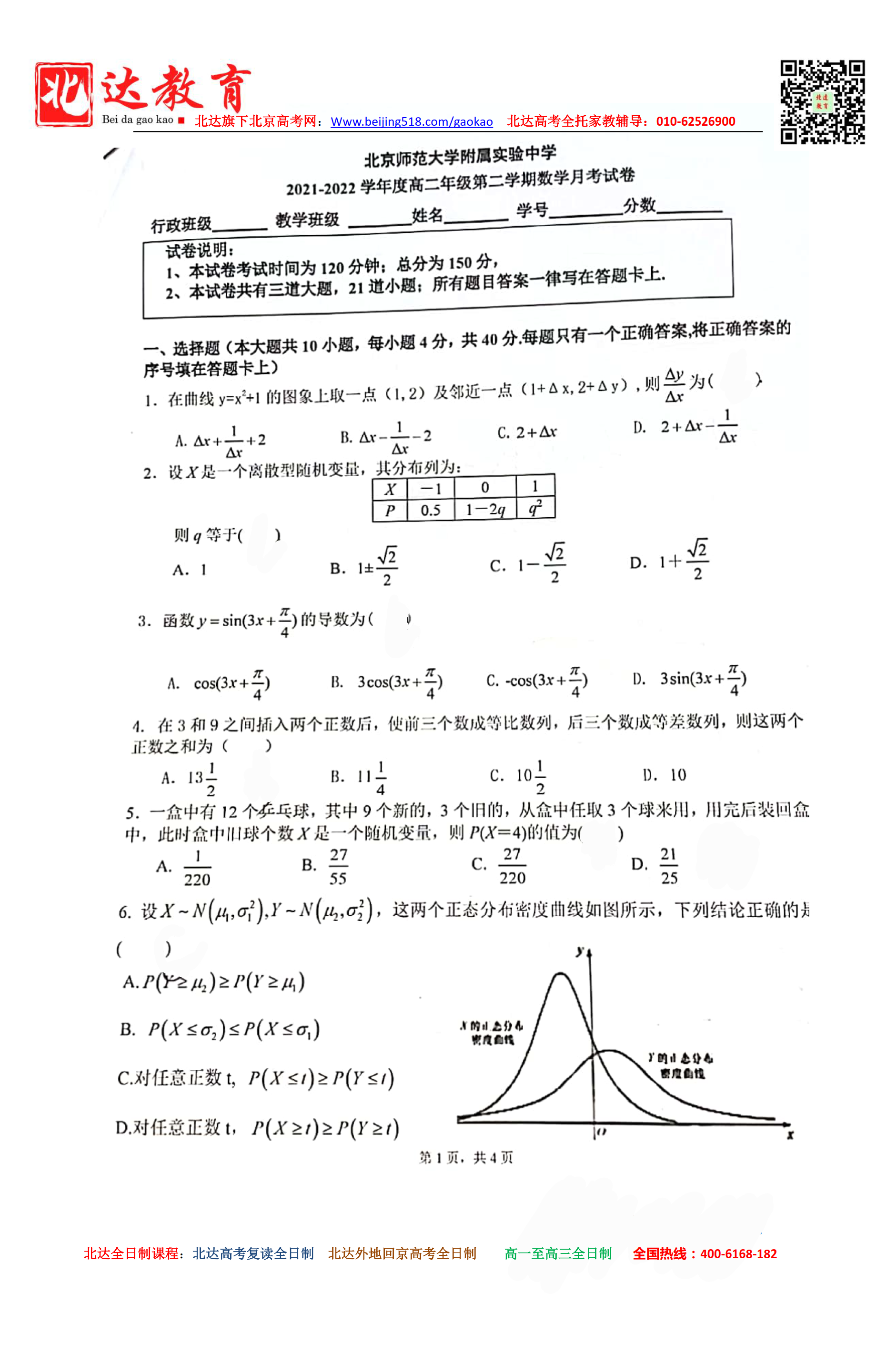 北京admw360教研组为大家整理了2022年北京师范大学附属实验中学高二年级6月月考数学试题,分享给大家。