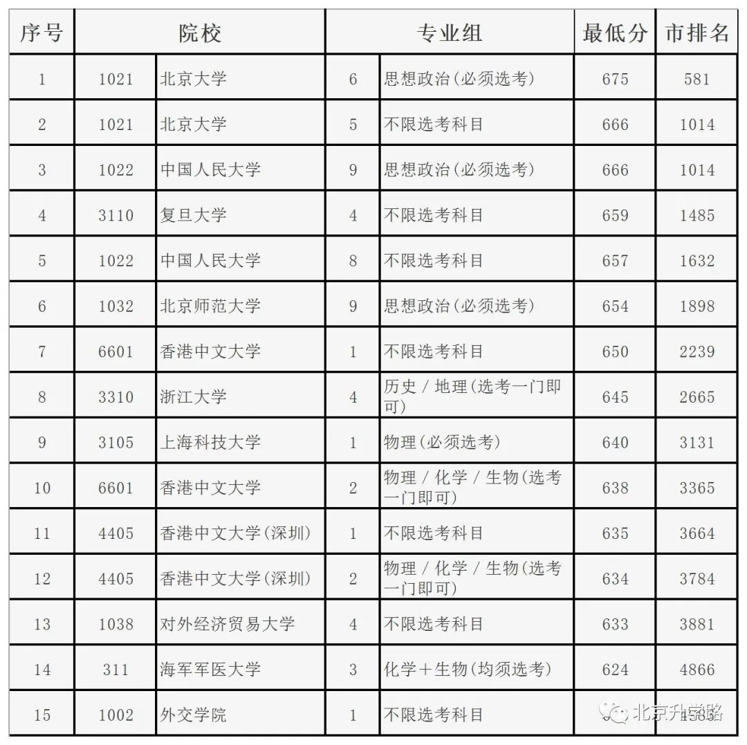 下表为2021年北京高考提前批普通A段和本科普通批录取分数线对应排名在5000以内的录取数据。2022届高考生志愿填报时可以参考。