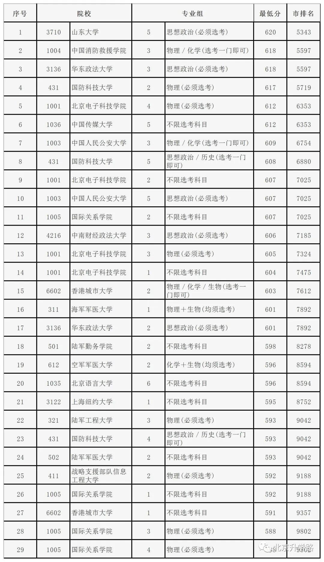 通过对比2020年的数据,我们发现,院校虽有少量增长,但是专业组数量相差不大。因此,北京市排名前一万名的考生可以参考相关院校录取分数线,为志愿填报增加录取概率。