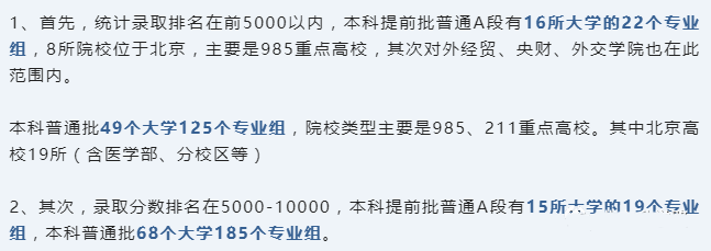 1、首先,统计录取排名在前5000以内,本科提前批普通A段有12所大学的15个专业组,5所院校位于北京,其中3所是985重点高校,其次对外经贸、外交学院也在此范围内。