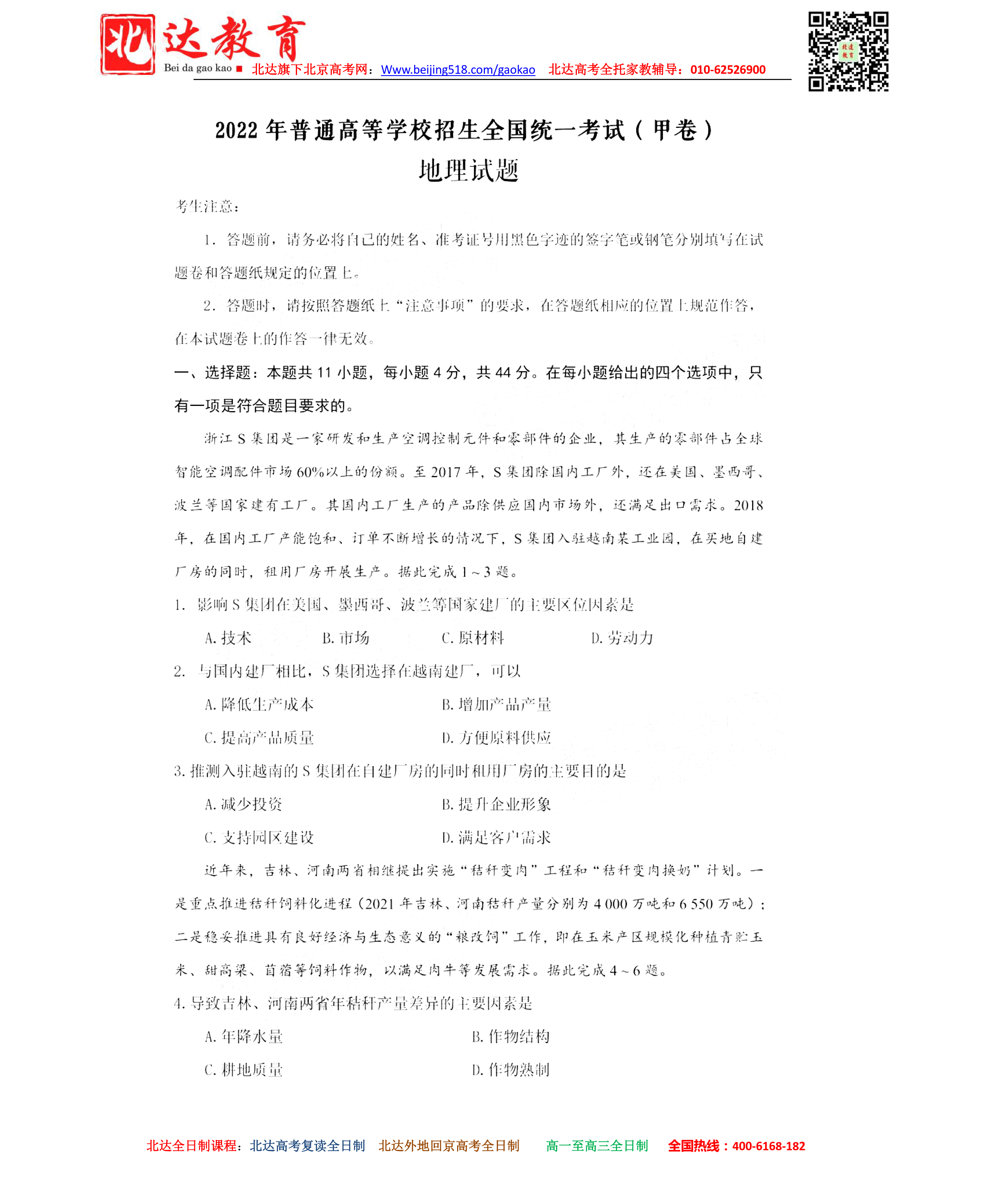 北京admw360教研组为大家整理了2022年高考(全国甲卷)文综地理试题,希望对大家有所帮助。 admw360高考复读、高考外地回京全日制招生通知 ★2022高考复读全日制,应届生全日制,外地回京全…
