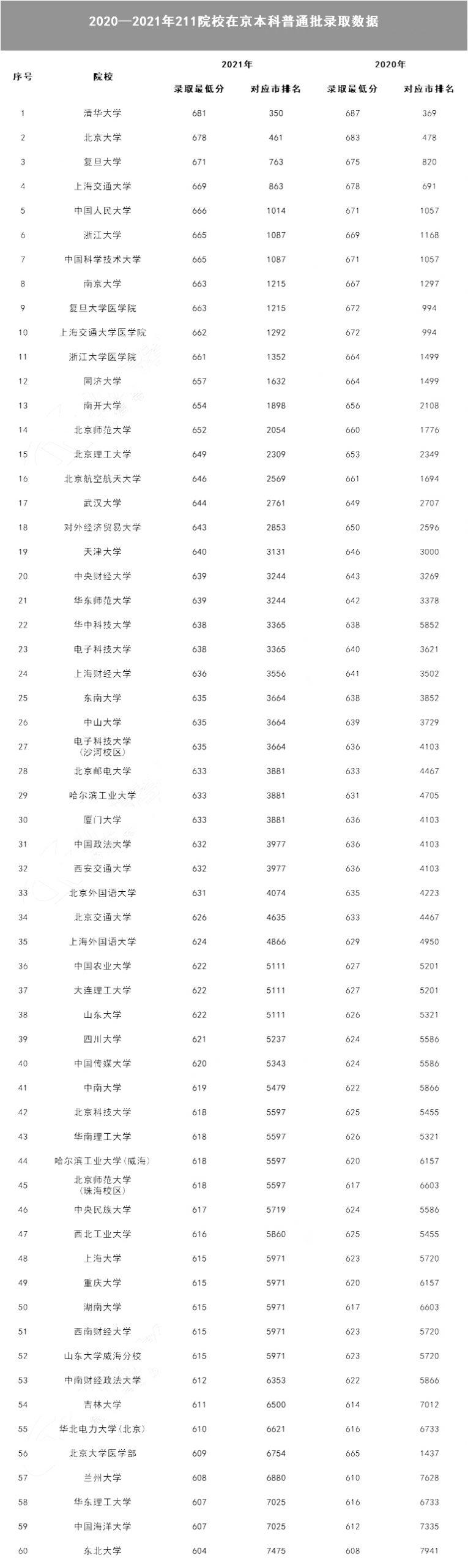 下表整理了全国211院校 2020—2021年在京本科普通批录取投档线及市排名,你的预估成绩可以报考哪所大学呢?