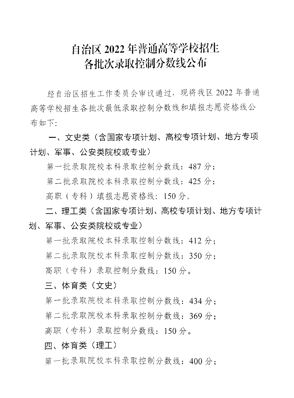 2022宁夏普通高等学校招生录取最低控制分数线: