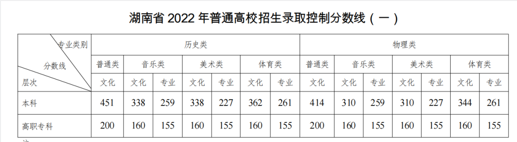 2022年湖南省高考招生录取最低控制分数线