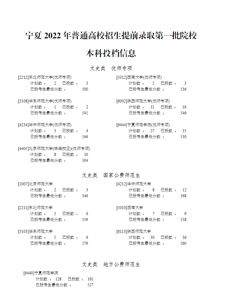 2022年宁夏高考(本科提前批)录取投档分数线