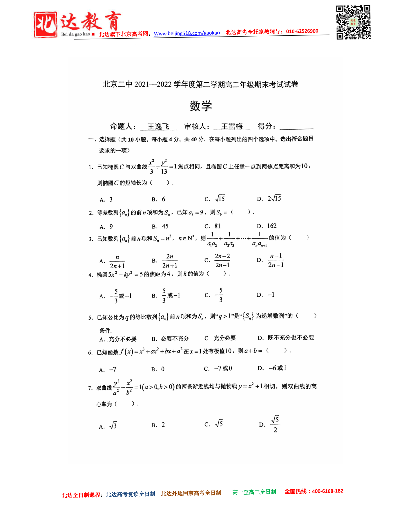 相关阅读:2021-2022年北京各区高二下学期期末考试试题及答案汇总