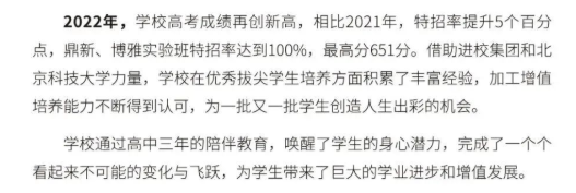 学校600分以上人数每年稳固在10%-20%之间,重点高校录取率保持强劲增长态势,几乎所有考生都能实现本科录取。2020年北京市新高考我校最高分651分,全市排名2504名,600分以上18人,525分以上38人。2021最高分649分,特招分数线上55人。2022年最高分641分。