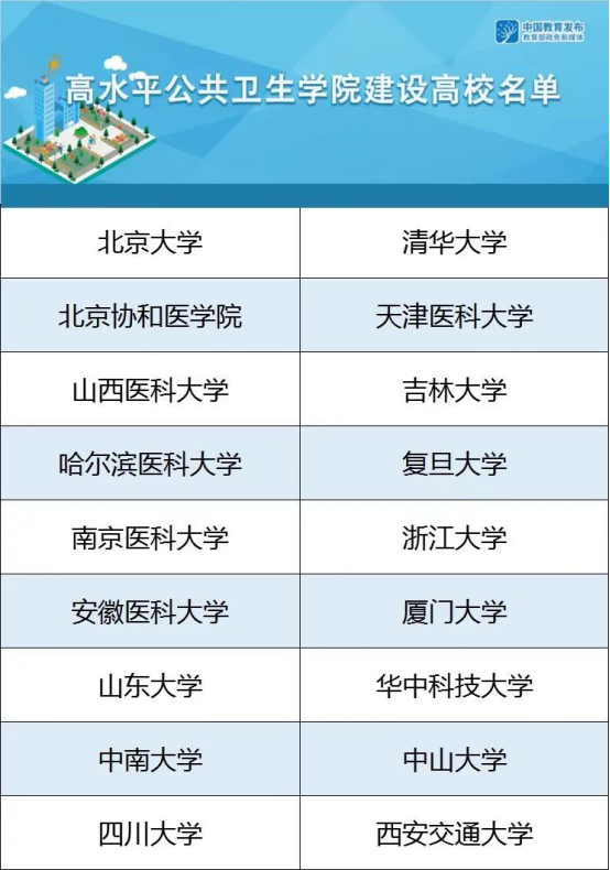 近日,教育部网站公示高水平公共卫生学院建设高校名单。根据《教育部办公厅等四部门关于开展高水平公共卫生学院建设的通知》(教高厅函〔2021〕38号)要求,经各地各有关高校自主申报、专家评议等相关工作程序,认定了北京大学等18所高校为高水平公共卫生学院建设高校。公示期为2022年7月14日至7月20日。
