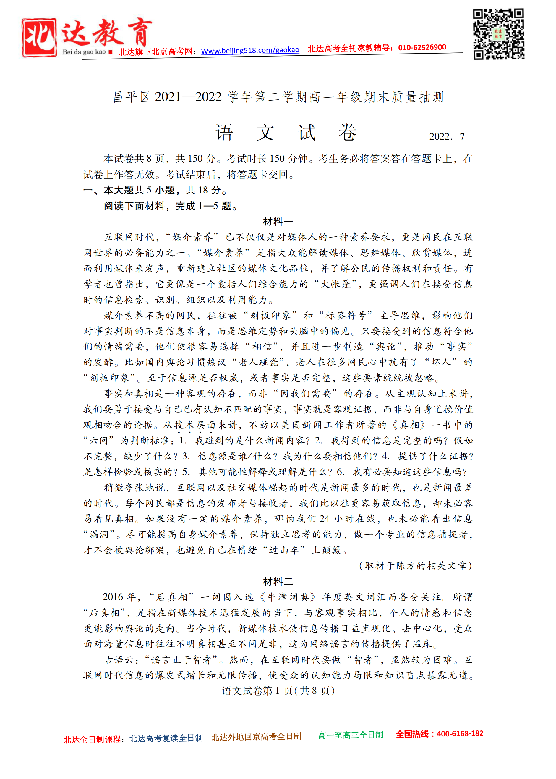 近日,北京admw360教研组为大家整理了北京市昌平区2021-2022学年高一下学期期末考试语文试题,需要的小伙伴赶紧下载吧。