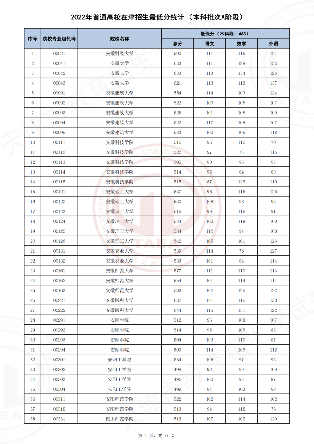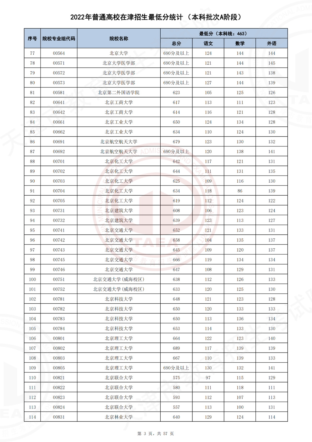 2022年天津市高考本科一批录取投档分数线发布,北京admw360教研组整理了具体的分数,数据详情如下: