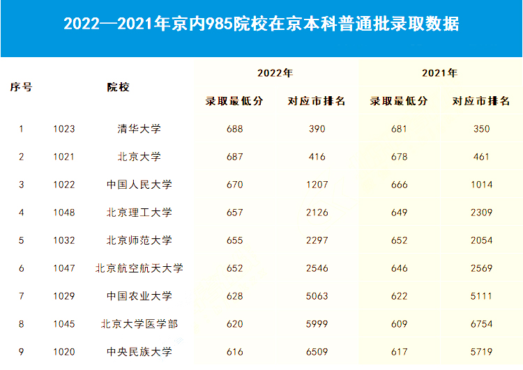 根据2022—2021年京内985高校在京本科普通批录取数据可以看出,与21年相比,22年各高校分数线整体持平稳状态。北京大学医学部增长11分,为涨幅最高的京内985院校。