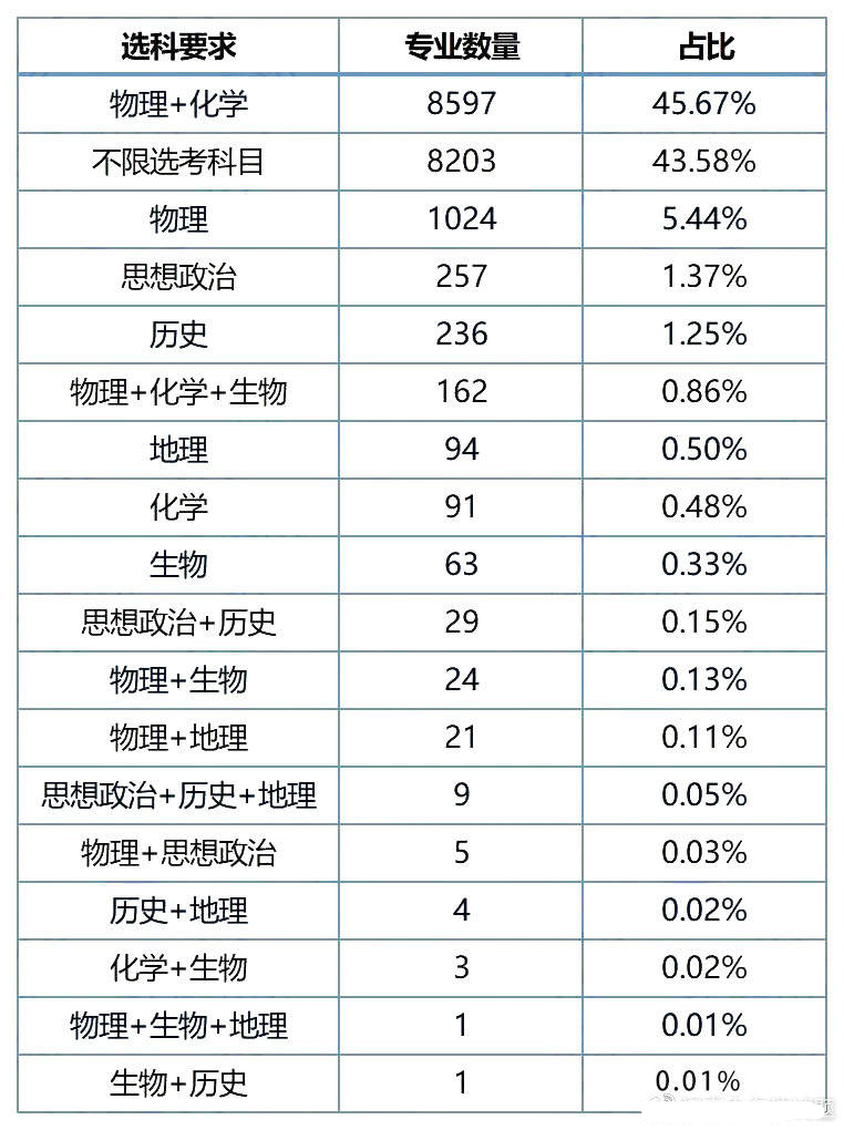 从总体的数据来看,只要考生的选科组合中包含了物理和化学两个科目,就可以满足约96.3%的专业的选考要求了。如果考生的选考科目为纯文的“历史+地理+政治”的组合,可以覆盖47.07%的专业的选科要求。
