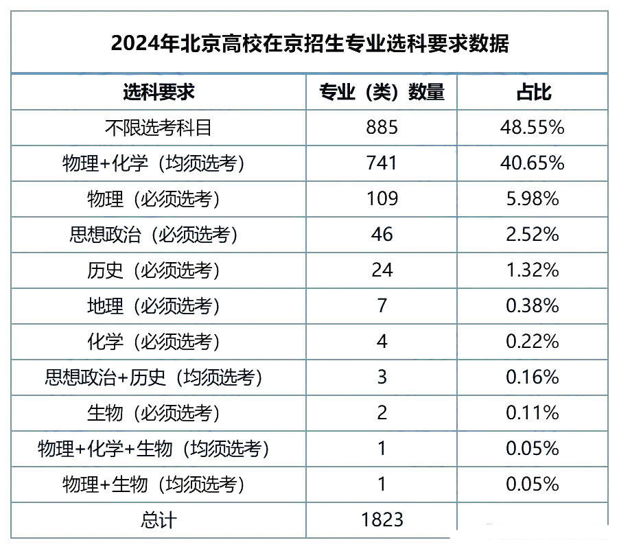 下面以北京高校的选科要求为例,展开介绍一下相关情况:2024北京院校招生专业选考科目要求中不限选科占比48.55%、物理+化学占比40.65%。其它组合呈现断崖式下跌,生物、地理、历史等可选专业范围较小。