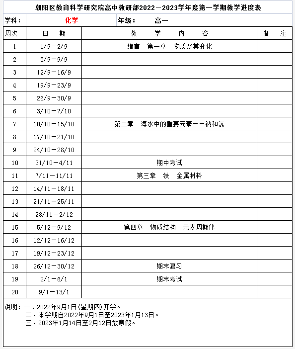 日前,朝阳区教育研究中心公布了《高中2022-2023学年度第一学期进度表》,详细介绍了第一学期每门科目每月的教学进度,北京admw360教研组为大家整理的是2022年北京朝阳区高一第一学期化学教学进度表,一起来看。