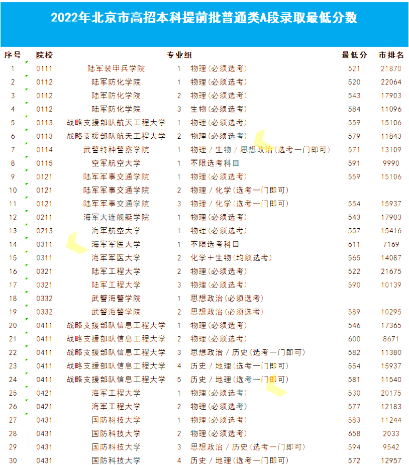 北京2022高招本科提前批普通类A段录取分数线及市排名