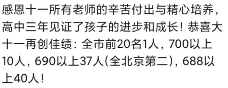 2022年十一学校高考再创佳绩!700分以上10人,全市前20名1人(也就是查不到成绩的那20人)。据说科实班平均分683分,这成绩是非常强的。科实班就是十一的科学实验班,能进科实班的基本上都是顶尖牛娃。