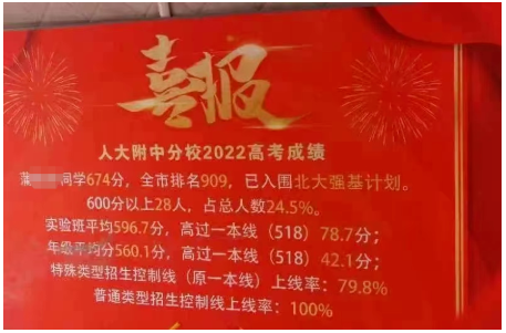 人分2022年高考成绩突破新高!最高分674分,全市排名909,已入围北大强基计划;600分以上28人,占总人数24.5%;实验班平均分596.7分,高过一本线(518)78.7分;