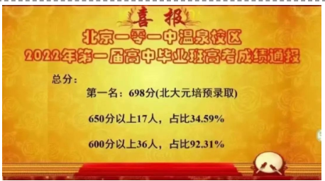 海淀101温泉2022年第一届高考,成绩优异!第一名698分,被北大元培预录取;650分以上17人,占比34.59%;600分以上36人,占比92.31%。