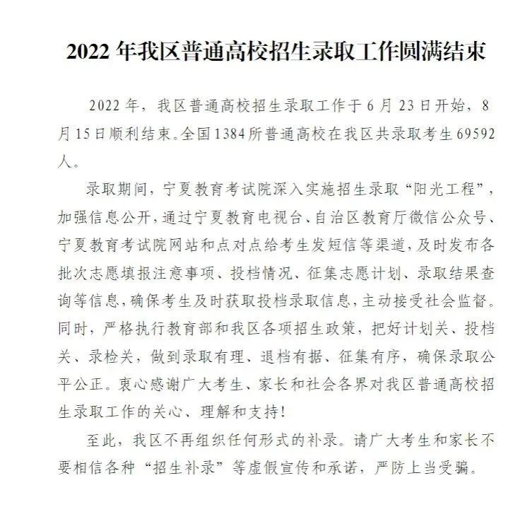 8月10日,我省2022年普通高考专科批次院校征集录取工作顺利完成,共录取2.95万人。至此,我省2022年普通高校招生录取工作顺利结束。
