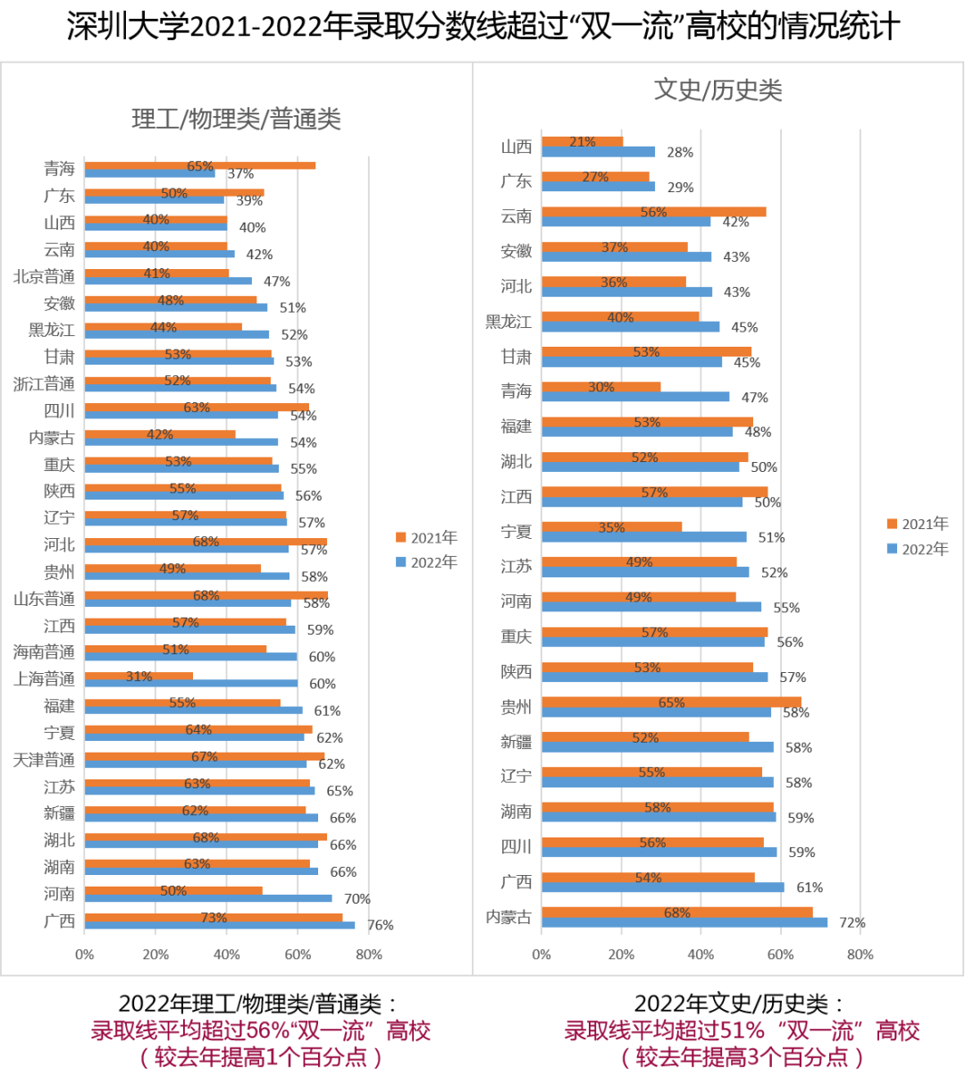 今年,深圳大学共面向全国31个省(自治区、直辖市)及港澳台侨招生,招生范围覆盖全国,共录取新生7436人(较去年增加306人),创历史新高,录取线平均超过约50%的“双一流”建设高校。为满足考生多元化发展需求,深圳大学今年进一步扩大卓越班和特色实验班的招生规模,并新增中外合作办学专业。
