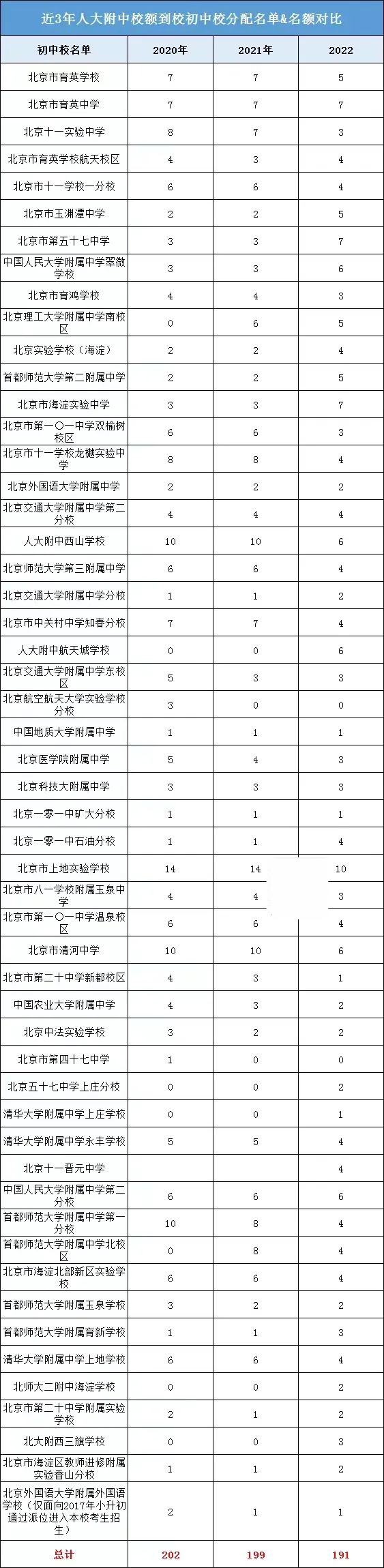 温馨提示:从近3年人大附校额到校名额来看,人大附对初中校的校额到校名额分配有增有减,需要注意的是2022年人大附将校额到校名额有新分配了5所初中校,分别是人大附航天城学校、北京十一晋元中学、北京五十七中上庄分校、清华附上庄分校、北大附西三旗学校。所以后期考生想要通过校额到校报考人大附还要看当年有没有分配名额给自己所在初中校,更要关注自己的校排名。