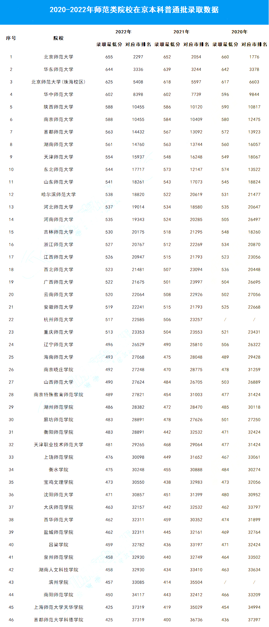 下表整理了师范类院校2020—2022年在京本科普通批录取最低分及市排名:(不含中外合办专业)