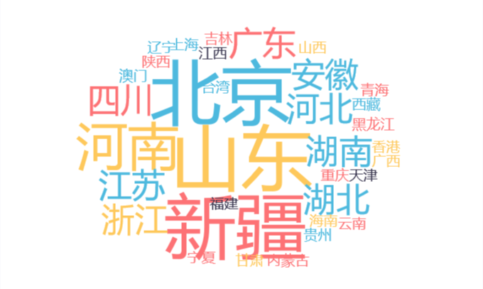 22级的BFSUers来自五湖四海,(除北京外)山东以97人位列第一,新疆以94人位列第二,河南以78人位列第三,浙江以76人位列第四,江苏以70人位列第五,湖南和广东同为68人,位居第六。