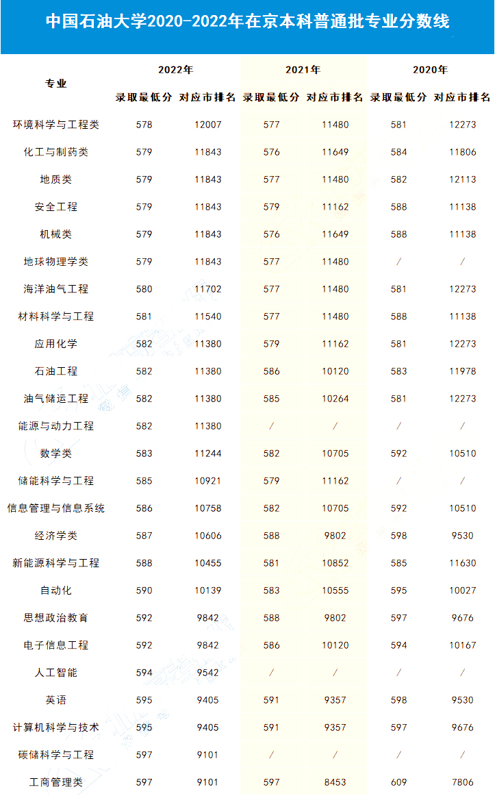 北京admw360教研组为大家整理了中国石油大学(北京)2020-2022年在京本科普通批录取专业分数线,一起来看: