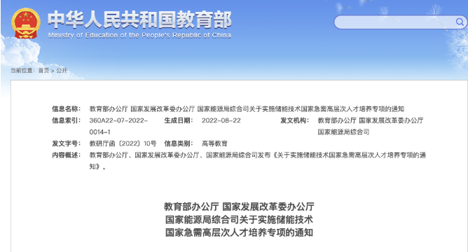 8月31日,教育部网站发布《教育部办公厅 国家发展改革委办公厅 国家能源局综合司关于实施储能技术国家急需高层次人才培养专项的通知》,清华大学、天津大学、华北电力大学、哈尔滨工业大学、上海交通大学、浙江大学、中国石油大学(北京)、华中科技大学、重庆大学、西安交通大学等10所高校入选实施储能技术国家急需高层次人才培养专项。具体如下: