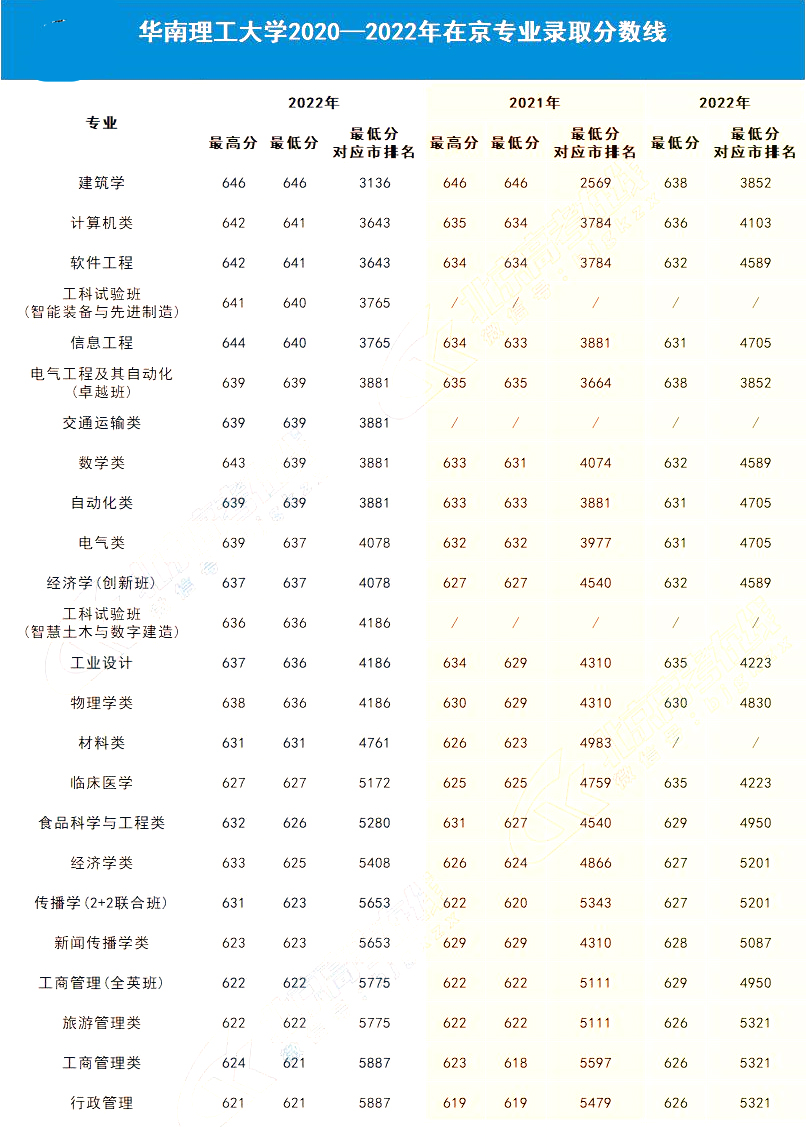 北京admw360教研组为大家整理了2020-2022年华南理工大学在京专业分数线,一起来看: