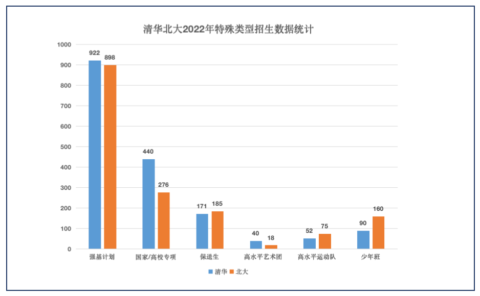 整体来看,清华、北大2022本科新生中特殊招生占比都相当可观,清华特殊招生人数1715+,占当年内地本科招生的50.44%;北大特殊招生人数约1613,占当年内地本科招生的41.84%。强基计划热度不减,招生来源越来越多样化。清北强基招生在本校特殊招生中均占比在50%以上,虽然北大强基计划破格生相比去年减少44人,但从整体上看,特殊类型招生增加接近100人,包括数学英才班增加的60+人,以及物理卓越计划录取的61人,同学们可根据自身情况,选择多种升学路径进行规划。