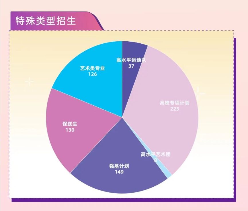 武汉大学共录取本科新生7393人,其中,特殊类型招生共674人,包括艺术类专业126人,高水平运动队37人,高校专项计划223人,高水平艺术团8人,强基计划149人,保送生130人。武汉大学特殊类型招生人数具体分布情况如下图: