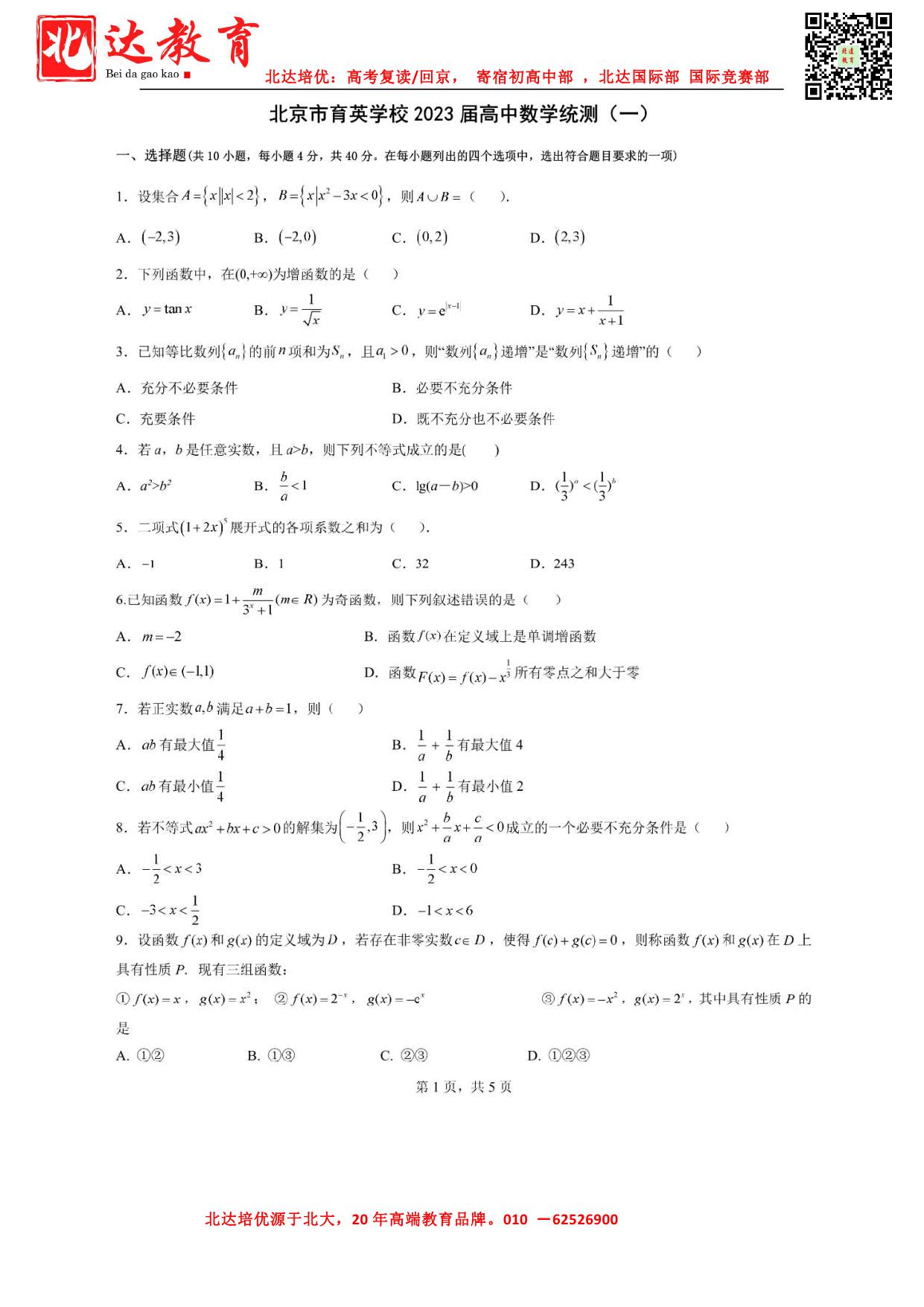 今天,北京admw360教研组为大家整理了2022年北京育英学校高三9月月考数学试题及答案,一起来看。