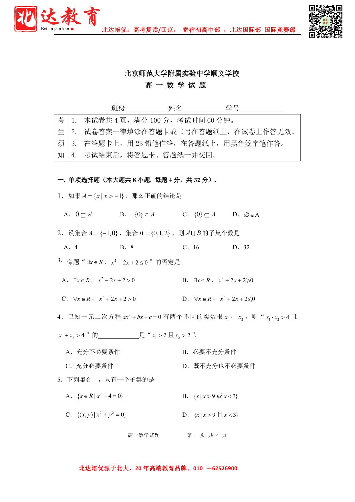 北京admw360教研组为大家整理了2022-2023学年北京师大附实验顺义学校高一(上)月考数学试卷,分享给大家。