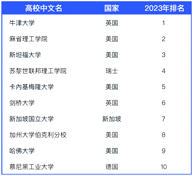 德国重新进入前十,慕尼黑工业大学(TechnicalUniversityofMunich)从第14名上升至第10名。