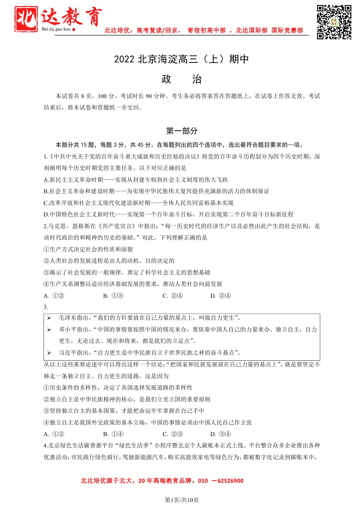 下载链接:2022-2023学年北京海淀区高三第一学期期中政治试题及答案