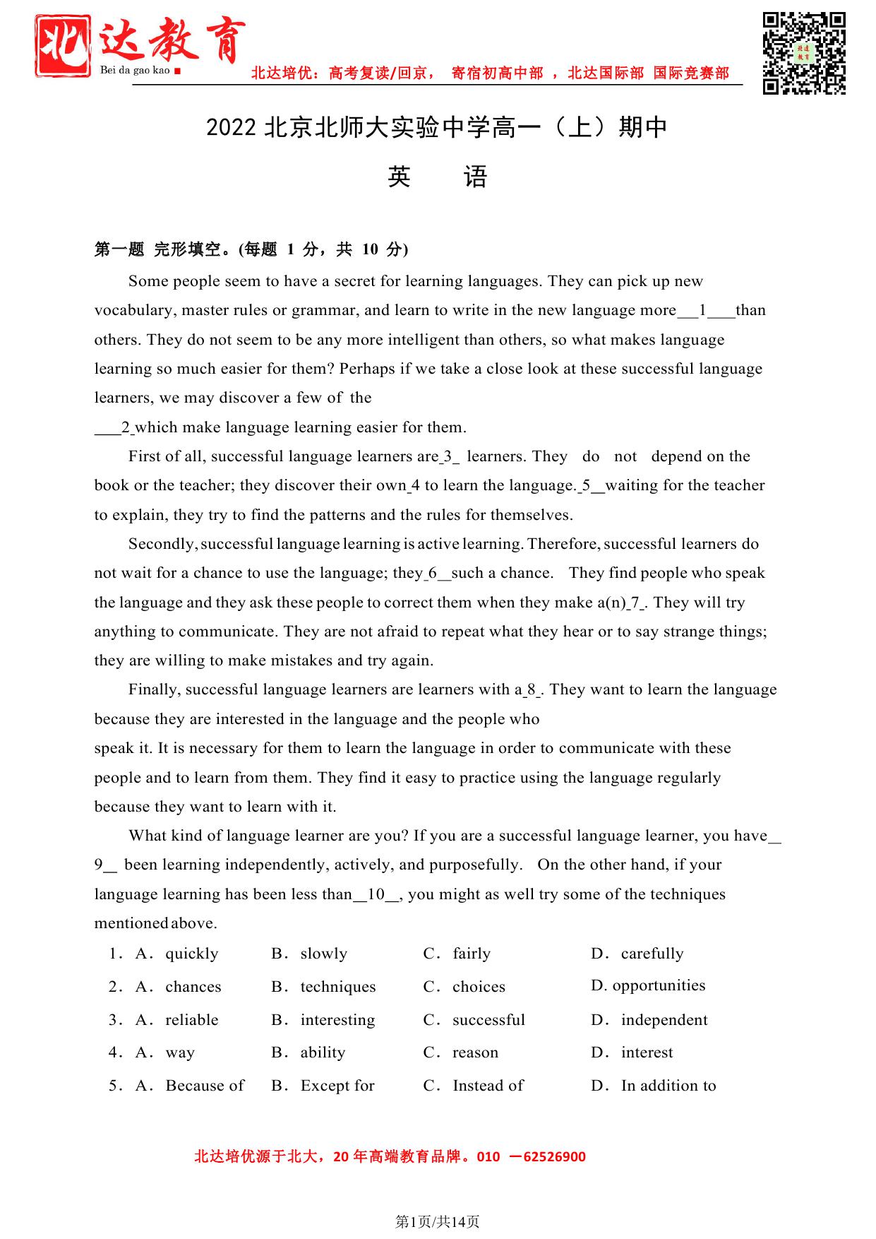 下载链接:2022-2023学年北师大实验高一(上)期中英语试题及答案