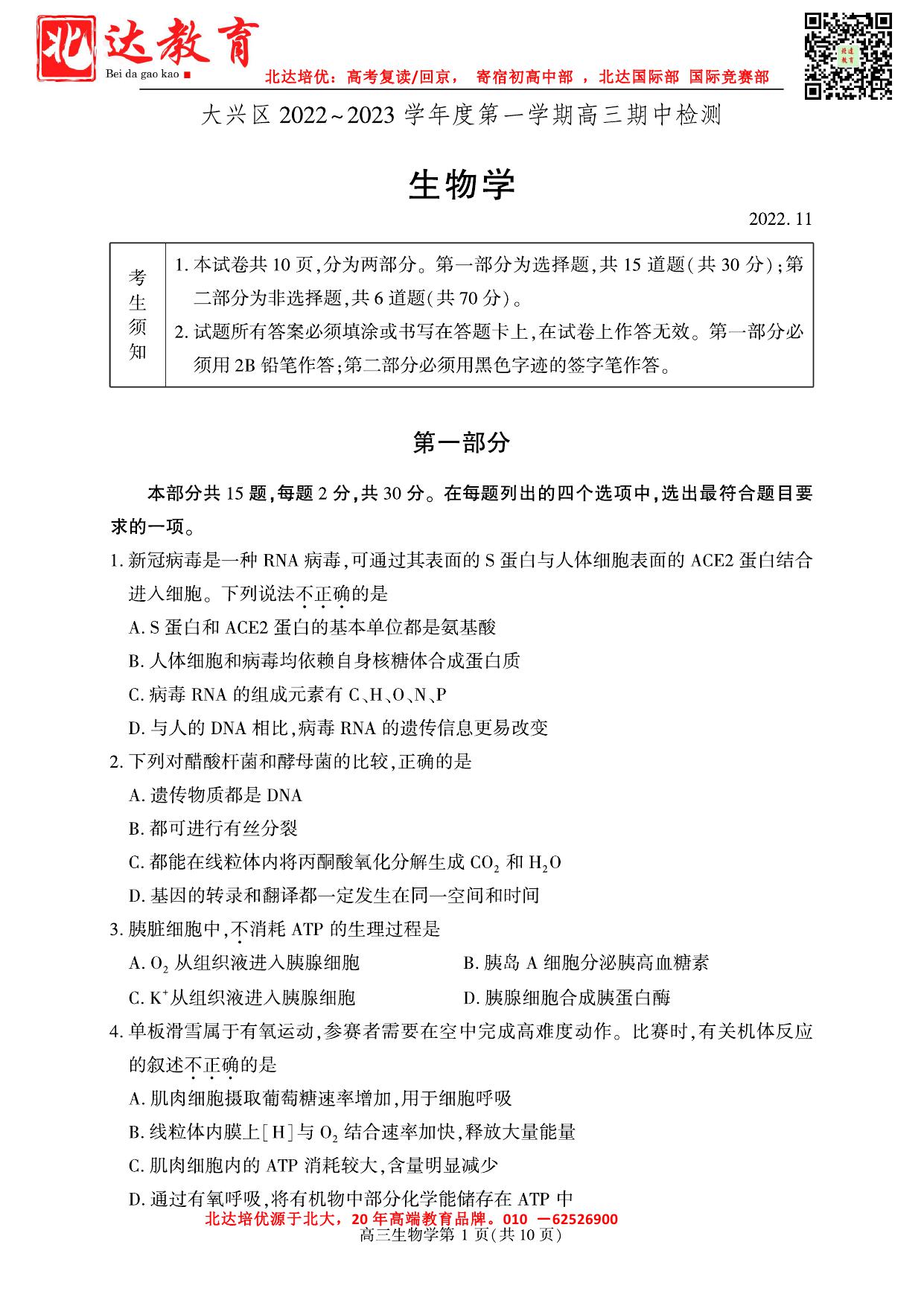 2022-2023学年北京海淀区高三期中考试与11月1日开考,北京admw360教研组收集整理了2022-2023学年北京大兴区高三第一学期期中生物试题,一起来看看。