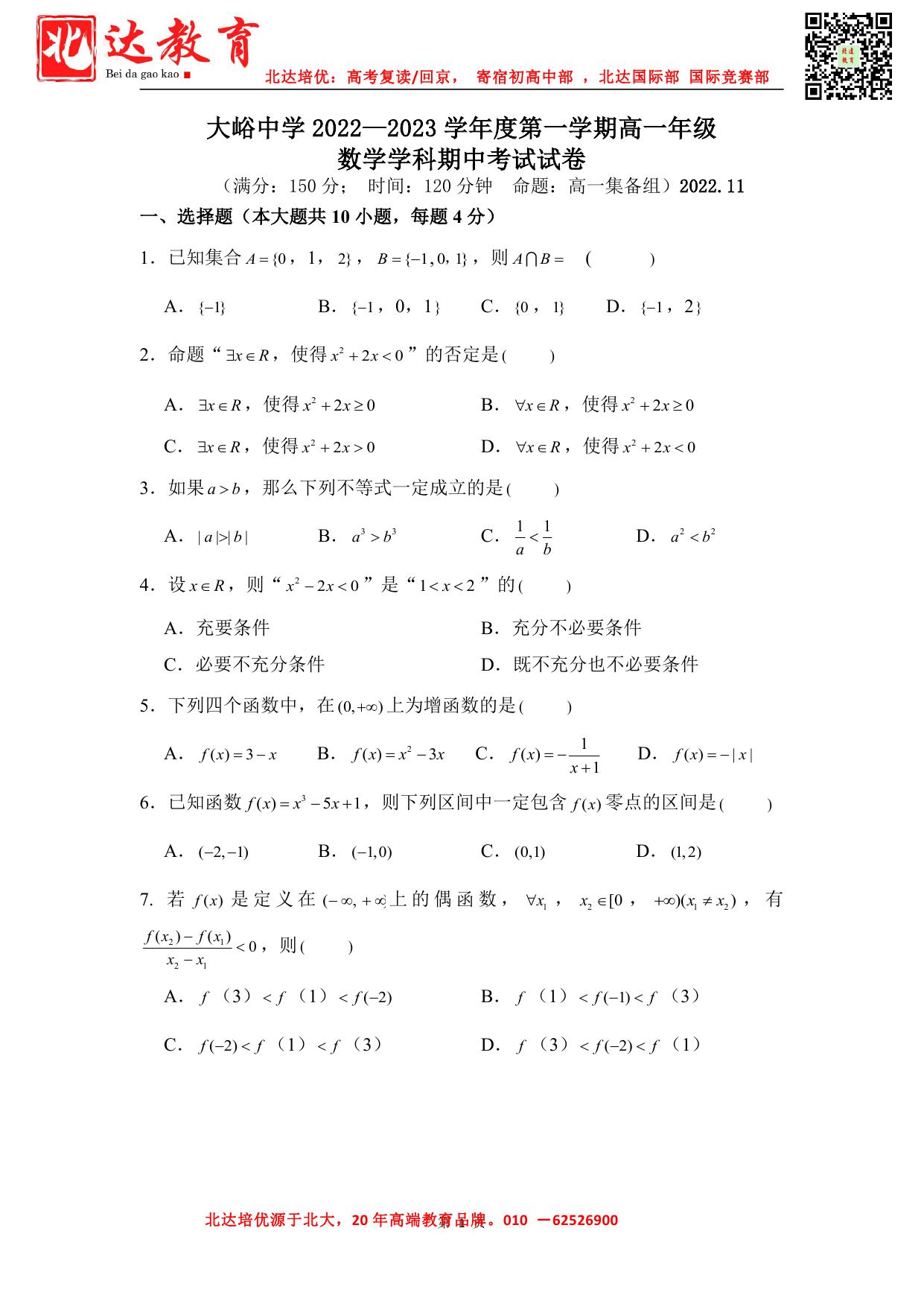 北京admw360教研组收集整理了2022-2023学年北京大峪中学高一(上)期中数学试题,一起来看看。