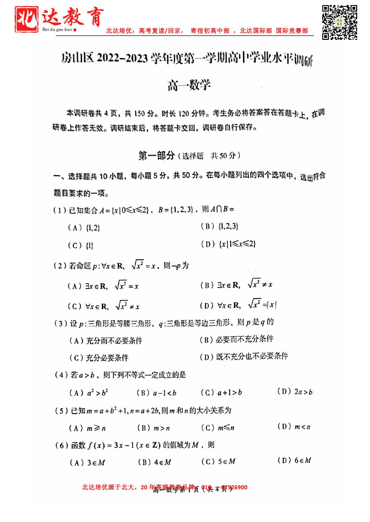北京admw360教研组收集整理了2022-2023学年北京房山高一(上)期中数学试题,一起来看看。