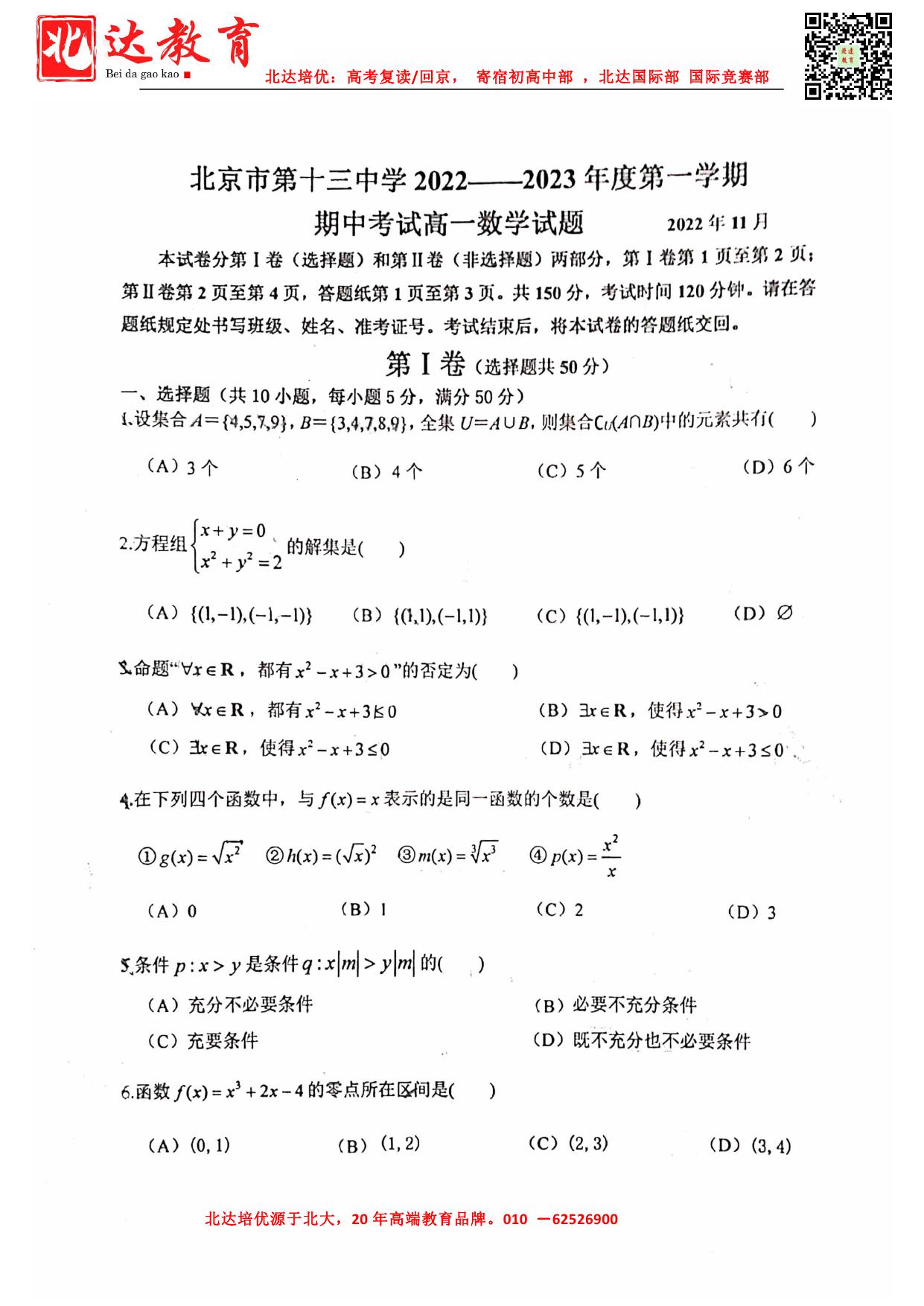 2022-2023学年北京十三中高一(上)期中数学试题及答案