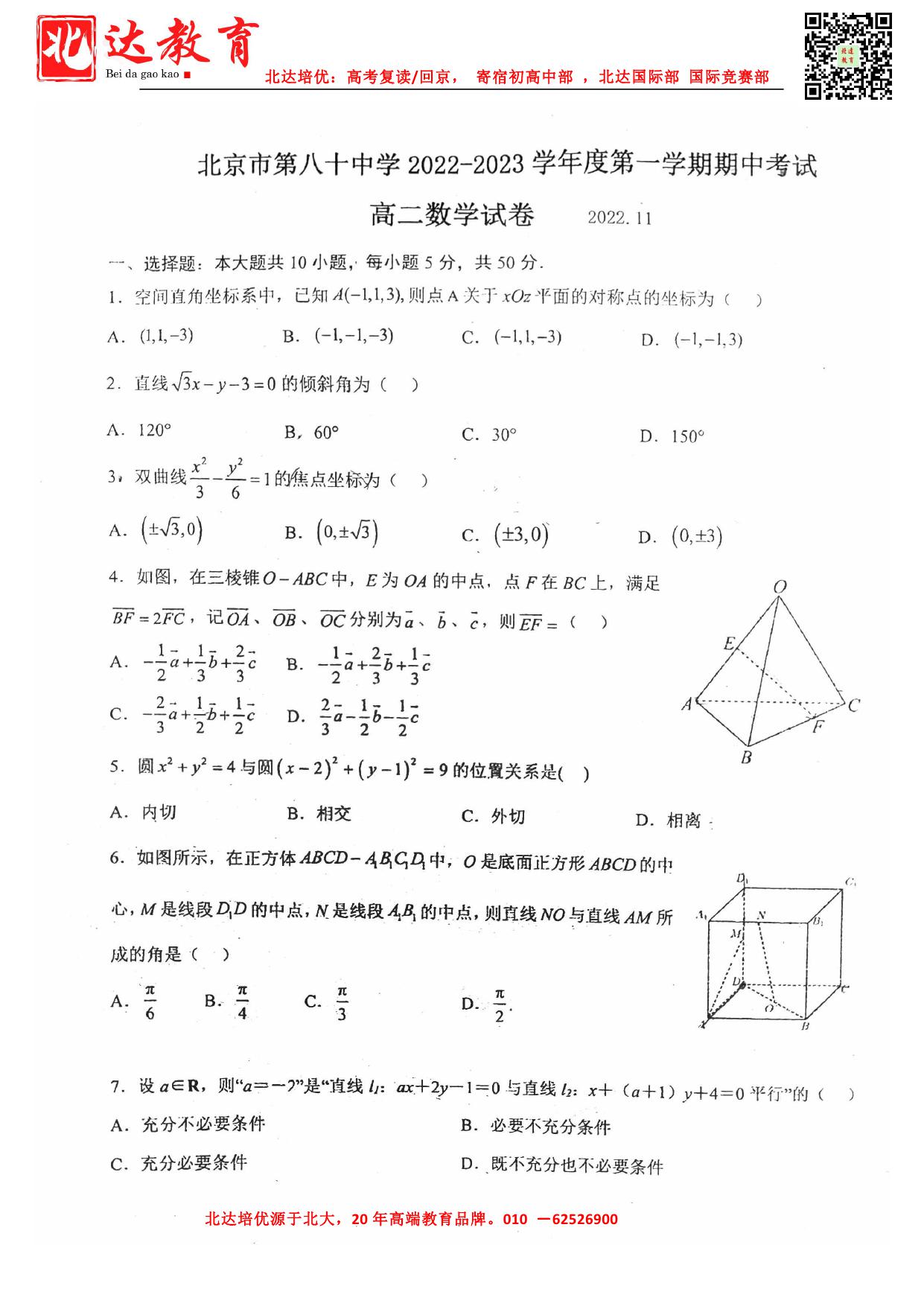 北京admw360教研组收集整理了2022-2023学年北京八十中高二(上)期中数学试题,一起来看看。