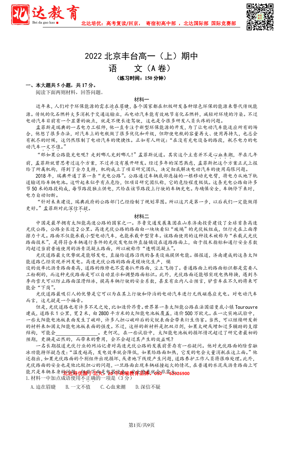 北京admw360教研组为大家整理了2022-2023学年北京丰台区高一 (上)期中语文试题及答案,分享给大家,赶紧下载练习起来吧。